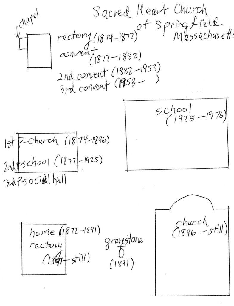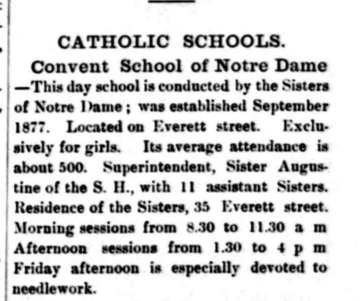 The school was at 27 Everett Street and was ready in August of 1877. In the beginning it was called the Convent School of Notre Dame. The church would be for a while on the ground floor and the school on the second floor. The third floor was a social hall. The cellar was for fraternal groups. The school was served by the Sisters of Notre Dame de Namur who also served the girls’ schools in Chicopee and Holyoke. They only served girls. In 1881 a high school system started. Boys were allowed into the elementary school only by 1908 but then that system was changed in 1925 since there was no room for them. After the 1970s the boys were allowed back into the school. When the school was razed, the statue that was in the front hallway of the school plus its corner stone and cross were saved.