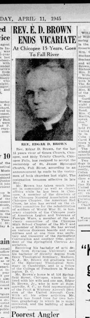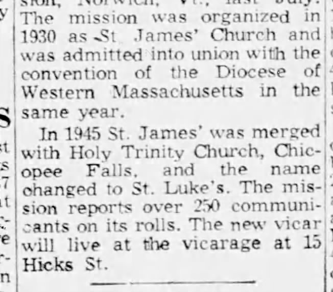 Holy Trinity Church of Chicopee was on Cochran Street in Chicopee Falls. It was founded in about 1926 as an Episcopal Church and existed until 1945. It then joined with St James of Springfield and became St Luke’s.