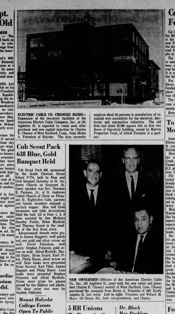 Behind you on Race Street is the former American Electric Cable Company. It started as American Braiding Company in 1918 but changed in the 1920s. They made strong laces and spun cable products. These items included making shoe laces. There was a name change decades ago. In recent history it is owned by Cubit. Holyoke Community College runs it as a culinary arts studio. Also there are residential units. In the basement there are small business units.