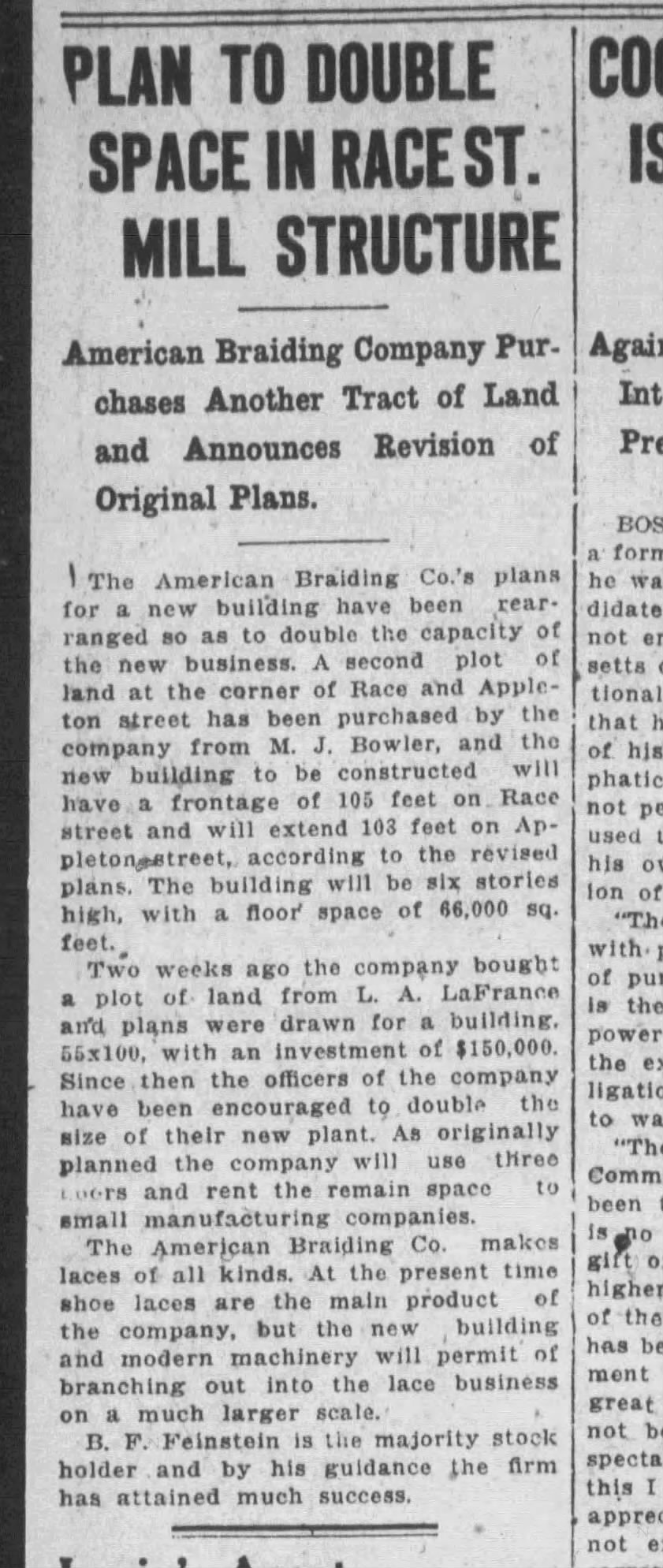 Behind you on Race Street is the former American Electric Cable Company. It started as American Braiding Company in 1918 but changed in 1922. In recent history it is owned by Cubit.