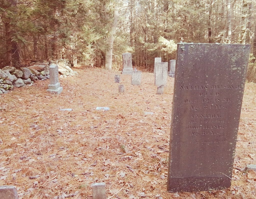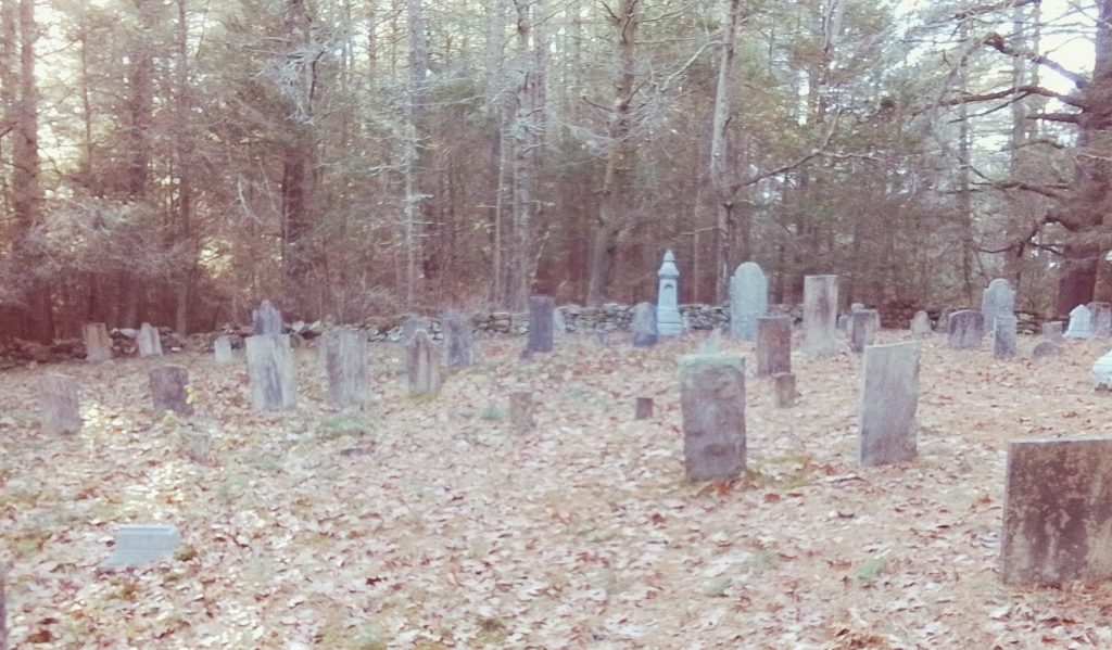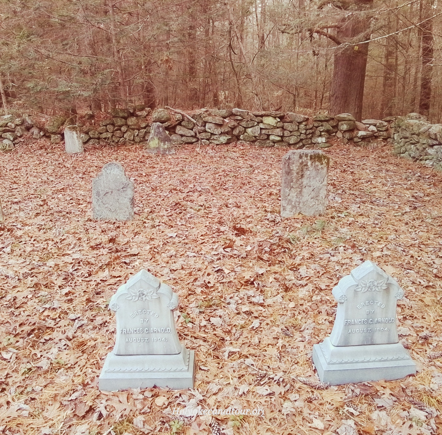 Arnold Burial Ground is from 1806. It is located on Amherst Road in Pelham at coordinates: 42.37918, -72.44054 Just east of the juncture of Meetinghouse Road and Enfield Road. To get to this location you will need to park alongside the highway at a put-in and then hike into the woods about 400 yards. Regular burials until 1917 except one later than that when a modern burial was put in. Also Gulley Potter is buried here but once was at the Quaker Cemetery which is found along the same dirt trail.