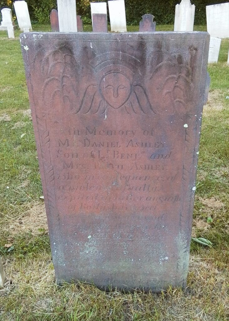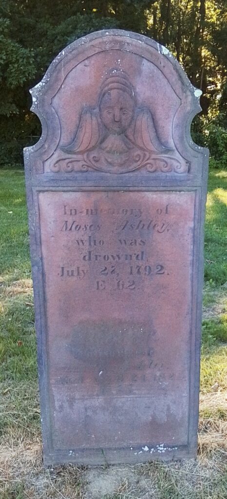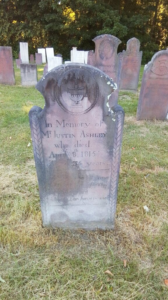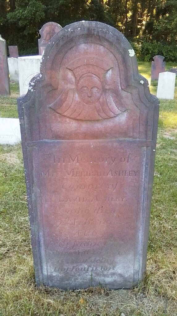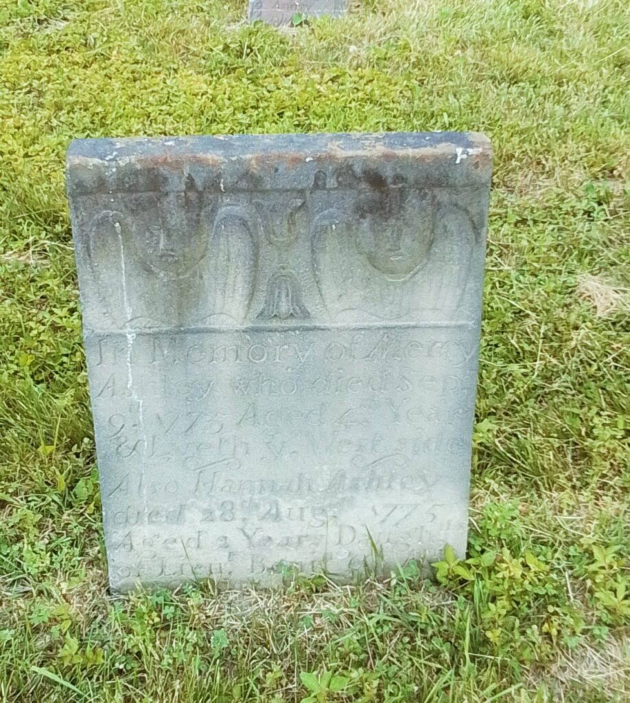 Mercy and Hannah Ashley have their 1775 gravestone together. Their stone is pointing correctly along an East to West alignment. No footstone. Their stone is the only one in the old section that was never moved. The baby section of the cemetery is in the back left of the old portion.