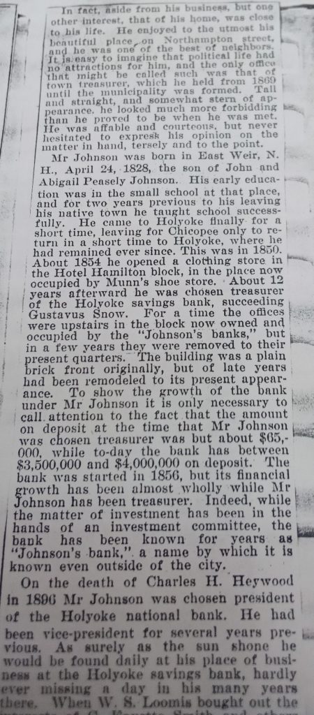House of Robert Johnson would start up the fire insurance company R B Johnson and Son. He would build a house for himself that was first at 208 Northampton Street and then after 1909 numbered to be 1425. He also ran the Holyoke Savings Bank. Both businesses were located at the Johnson Block at 201 High Street. See more IMAGES.