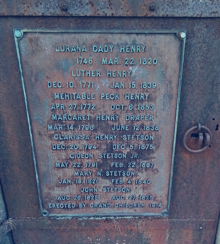 The Luther Henry Tomb Yard abuts the West Cemetery. The town took over the yard in 1954. Burials started there in 1820. The Luther Henry Tomb is from 1839. The west half of the cemetery is for the Luther Henry family and the east half for the Samuel Henry family.