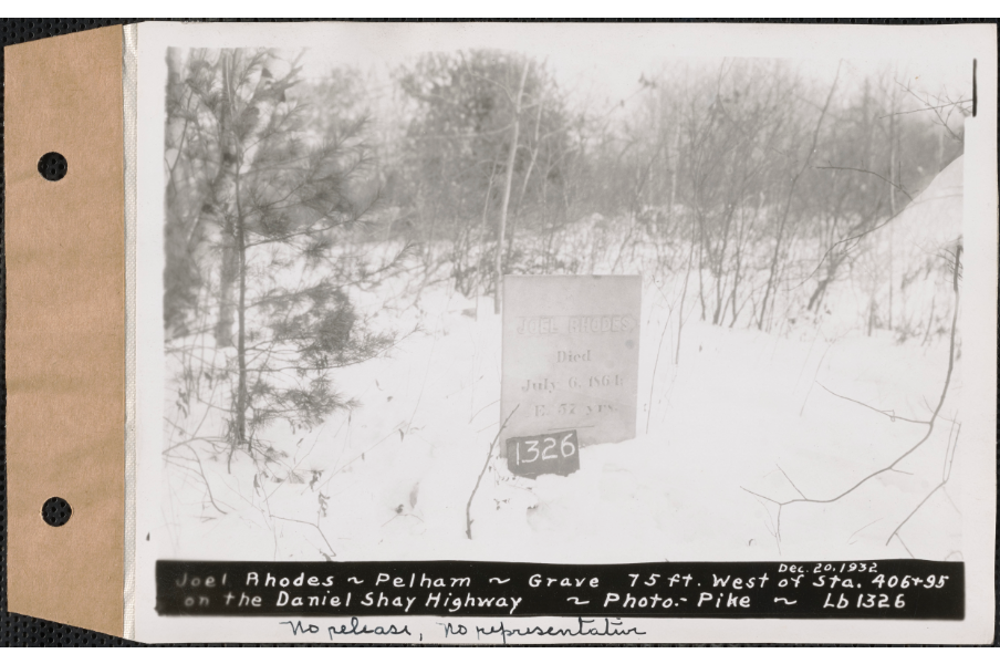 Joel Rhodes Burial Site is in Pelham at the juncture of Shays Highway and Shutesbury Road. Died of small pox and buried in the back southeast corner of the family farm in Pelham. Gravestone and burial is still there. “No Release” means that the body was left there and not released to another cemetery.