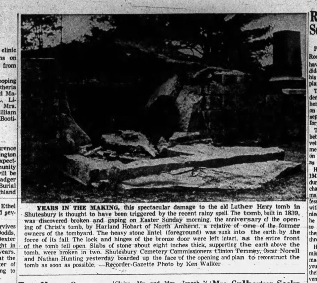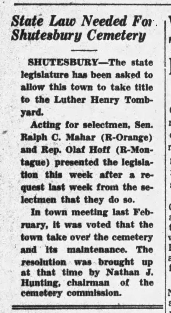 The Luther Henry Tomb Yard abuts the West Cemetery. The town took over the yard in 1954. Burials started there in 1820. The Luther Henry Tomb is from 1839. The west half of the cemetery is for the Luther Henry family and the east half for the Samuel Henry family.