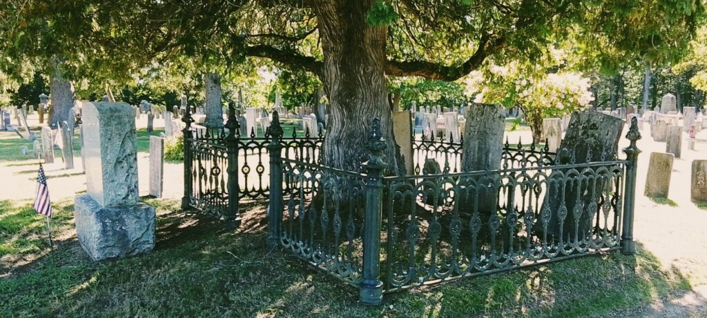 The fence around the Chapman area is from 1835 and is most likely to avoid graverobbers. The poled off area around the Chauncey Clapp area is for a family plot. In front of the plot is the early burials of the Clapp family.